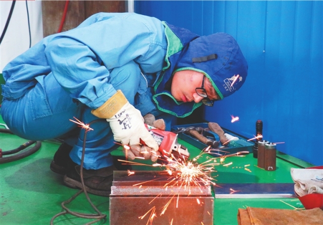 参加全省机冶石化系统焊工技能竞赛的选手进行焊缝打磨。