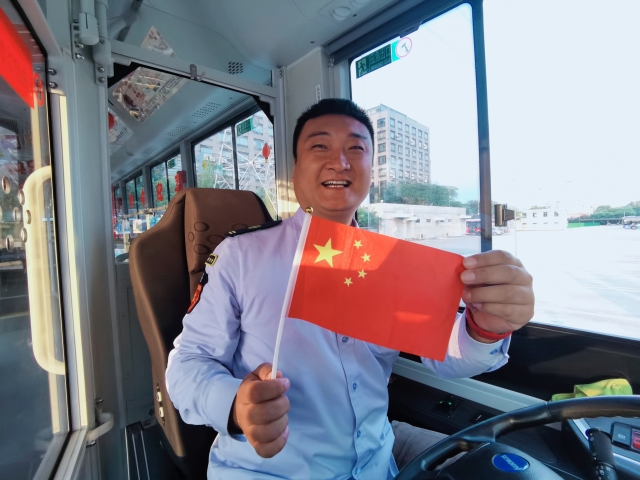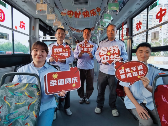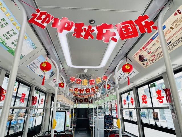 走进29路公交车,映入眼帘的是车厢顶部悬挂标有“迎中秋庆国庆”“我爱祖国”等装饰,车窗上张贴着融合中秋和国庆元素的艺术贴纸,红色的灯笼随车晃动,节日氛围浓郁。公交车司机师傅不禁拿出小红旗和写有“爱我中华”“共筑中国梦”的标牌,为祖国母亲庆生。