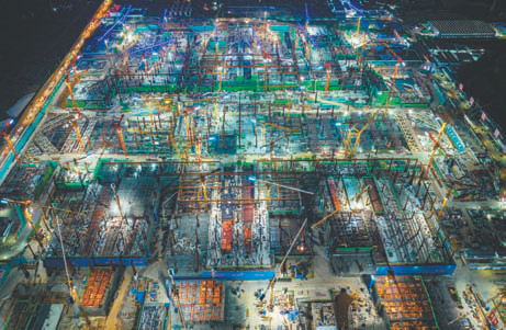 10月6日,中国石化华东石油局草舍油田新入职员工在月光下进行设备巡检。沈志军 金华 摄10月2日,中铁十二局职工坚守在沪渝蓉高铁泰州段建设施工现场。汤德宏 摄10月8日晚,南京北站建设工地灯火通明,建设工人坚守施工岗位。吴斌 摄金秋十月,华诞同庆。有一群人依然坚守在建设岗位上,用行动诠释责任,以奉献书写担当。