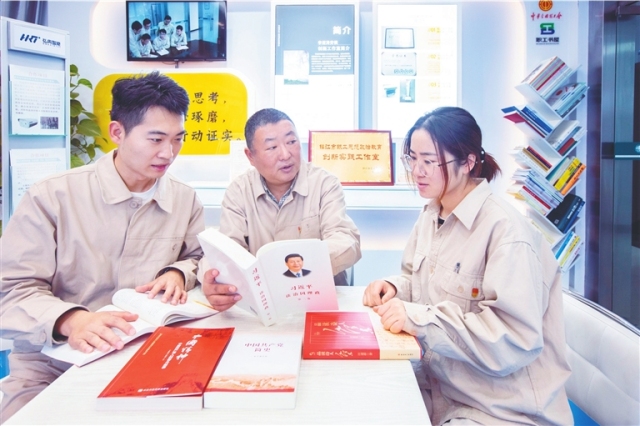 全国五一劳动奖章获得者、国家电网公司优秀班组长李迎涛在他工作的京口变电运维班,带领党员们共同学习习近平新时代中国特色社会主义思想。