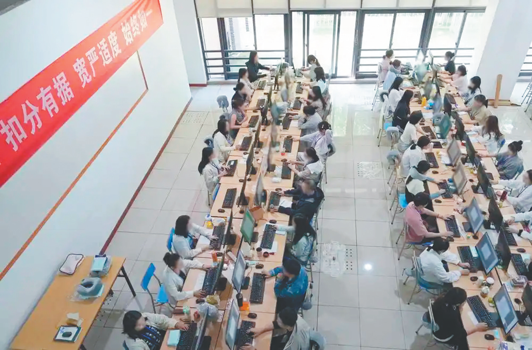 经过两道关口,记者进入评卷现场。《评卷员守则》张贴在最醒目的位置,明确规定评卷人员的十八个“不得”;阅卷教师坐在电脑前专注地评阅,电脑屏幕上显示着扫描题块。现场非常安静,只有敲击键盘发出的轻微哒哒声。