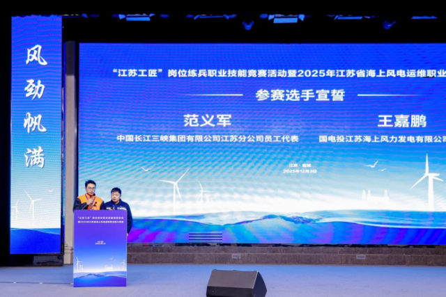 12月3日下午,在江苏省人力资源和社会保障厅指导下,由江苏省省部属企事业工会、江苏省可再生能源行业协会、中国长江三峡集团有限公司江苏分公司联合主办的“江苏工匠”岗位练兵职业技能竞赛暨2025年江苏省海上风电运维职业能力竞赛,在盐城大丰华东国际会议中心隆重开幕。