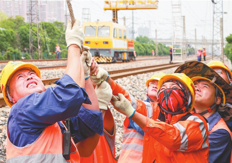 中国中铁电气化局运管公司徐州维管段60余名“蜘蛛侠”日前顶着“秋老虎”的炙烤,齐聚京沪线,共同启动软横跨更换大修作业。接触网工们各负其责、配合默契,现场呼唤应答声此起彼伏。经过80分钟紧张、有序的酣战,大修作业顺利完成。李志胜 廖娜 摄