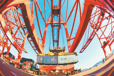 连日来,连云港港船舶接踵而至,车辆穿梭运行,各码头泊位多条生产线开足马力,加紧进出口货物装卸运输,一派热火朝天的繁忙景象。据统计,1—10月份,连云港港完成货物吞吐量同比增长7.8%,其中外贸吞吐量同比增长12.08%,集装箱量同比增长8.82%。图为11月7日,繁忙的连云港港口码头。耿玉和 摄